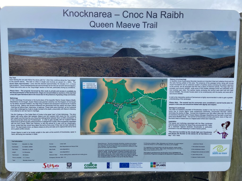 Queen Maeve, once the ruler of Connaught is reportedly buried at the top of Knocknarea, Co. Sligo. Maeve was known as a fierce warrior and competitor as evidenced in the legend of the cattle raid of Cooley.