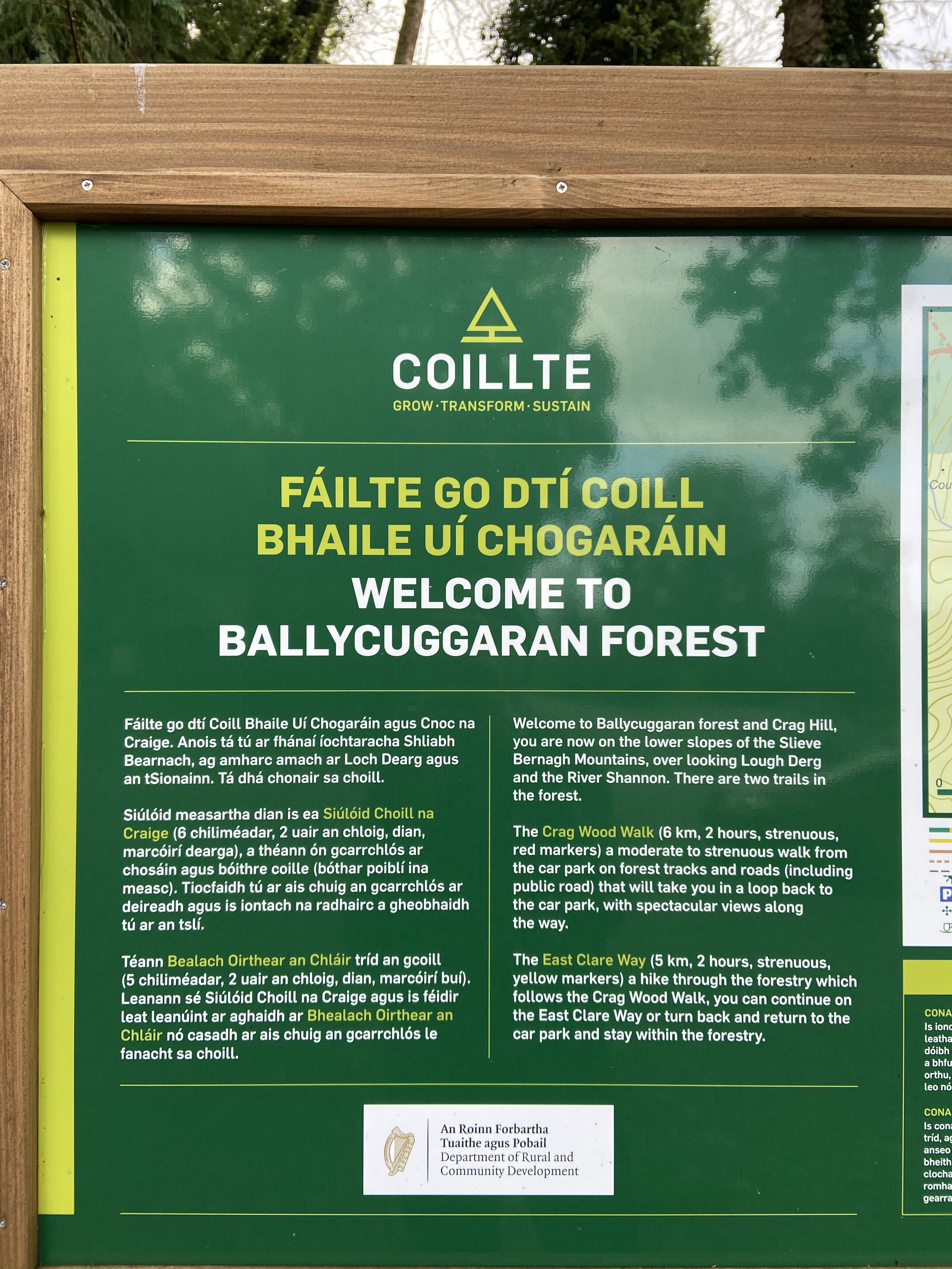 There are different options depending on the route you choose. We parked the car in Ballycuggaran Forest car park and completed the hike from there. The car park is free. No facilities available here.