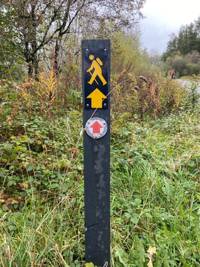 Continue until the red arrow points you downhill but the yellow arrow continues upwards. At this point you need to follow the yellow arrow. This is the junction;